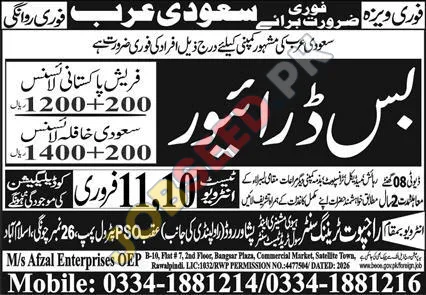 M/s Afzal Enterprises OEP, a licensed overseas employment promoter, has announced urgent vacancies for bus drivers in Saudi Arabia. This is a fantastic opportunity for individuals seeking stable employment and career development in the Middle East. Successful candidates will benefit from these vacancies. The positions offer attractive salary packages and benefits, including accommodation and medical facilities, provided by the employer in Saudi Arabia.