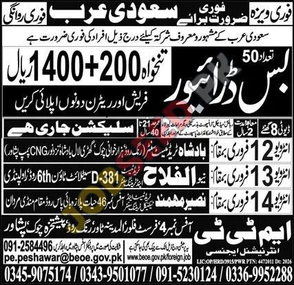 Discover the latest bus driver vacancies in Saudi Arabia for Pakistani nationals. This position represents excellent best career opportunities in the region. A leading Saudi company is offering attractive employment packages, including a monthly salary of 1600 SAR, for 50 positions. Candidates aged 21-40 with relevant experience are invited to attend walk-in interviews in Peshawar, Rawalpindi, and Mardan. This is a prime opportunity for individuals seeking high-paying overseas jobs in the transportation sector.