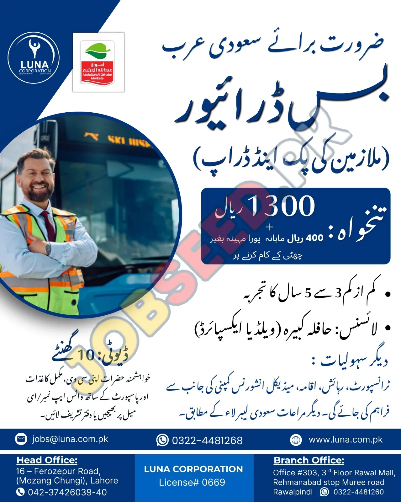 Seeking experienced Bus Drivers for pick and drop services in Saudi Arabia. Additionally, career development are available for qualified candidates. This opportunity offers a competitive salary with additional monthly allowances. This position represents excellent Bus Driver jobs Lahore in the region. This is an exciting career opportunity with LUNA Corporation offering stable employment and professional growth. Apply now for the latest job openings!