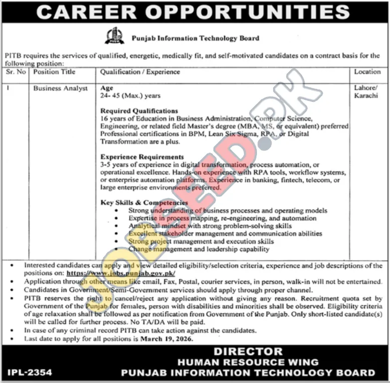 Explore exciting career prospects as a Business Analyst with the Punjab Information Technology Board (PITB). This government sector role offers a contract-based position for energetic and qualified individuals. We are seeking professionals with a strong foundation in business administration, computer science, or engineering, ideally holding a Master's degree or equivalent. If you possess 3-5 years of experience in digital transformation, process automation, or operational excellence, with hands-on expertise in RPA tools and workflow systems, this is your chance to contribute to enterprise automation platforms. This role is ideal for those looking for government jobs in Lahore or Karachi, offering a pathway for professional growth and development within a leading public sector organization.