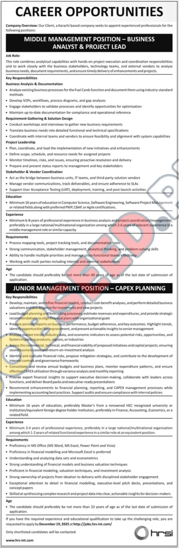 Human Resource Solutions International HRSI is now recruiting in Karachi. Apply for the position of Business Analyst & Project Lead. The required qualification is Master. This role is within the Management industry. The application process commenced on 05 December, 2025 via Jang Newspaper. Interested and eligible candidates must submit their applications before the deadline on 19 December, 2025. This is a prime opportunity to join a renowned organization. For a step-by-step application guide and full eligibility criteria, please see the official advertisement on https://www.jobseed.pk.