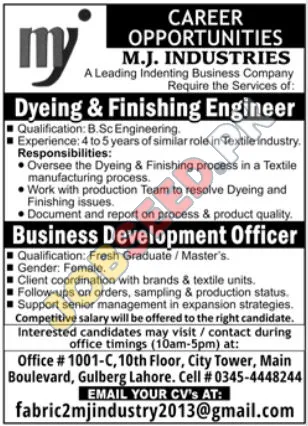 M.J. Industries in Lahore is hiring for Business Development Officer and Dyeing & Finishing Engineer positions. Apply now for textile industry jobs in Pakistan.