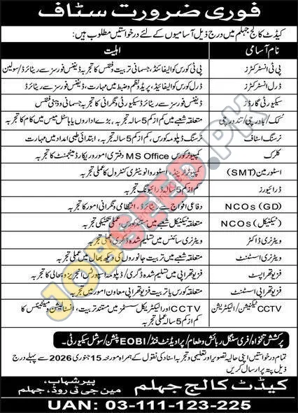 Cadet Colleges, Jhelum invites applications from eligible candidates for the post of PT Instructor, Drill Instructor, Security Guard, Cook / Cook / Healthy, Nursing Staff, Clerk, Storeman (SMT), Driver, NCOs (GD), NCOs (Technical), Veterinary Doctor, Veterinary Assistant, Physiotherapist, Physiotherapy Assistant and CCTV Technician / Electrician as per advertisement of 05 January, 2026. Diploma, Middle, Intermediate, Matric, MBBS educational qualification will be preferred.