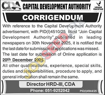The Capital Development Authority (CDA) has announced a job opening for a Director. As per the corrigendum, all other qualifications, experiences, skills, duties and responsibilities, and the application procedure, remain the same. CDA is looking for a qualified and experienced individual to fill this key role.