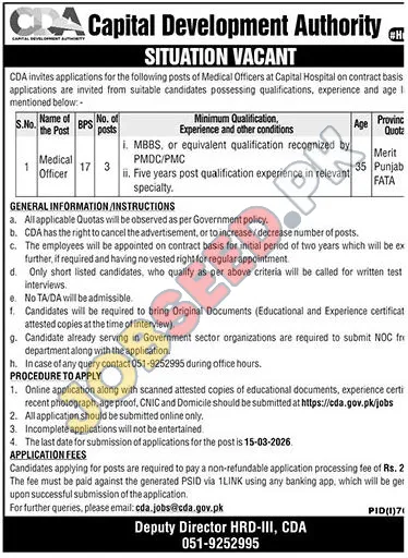Explore exciting government job opportunities with the Capital Development Authority (CDA) for Medical Officers at Capital Hospital. This is a prime chance for qualified medical professionals to join a reputable public sector organization on a contract basis. We are seeking dedicated individuals with an MBBS or equivalent qualification recognized by PMDC/PMC, coupled with five years of post-qualification experience in a relevant specialty. This role offers a competitive salary and the potential for professional growth within a government setting. Discover the latest government vacancies and advance your career in healthcare.