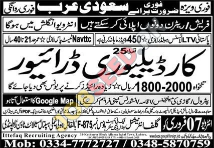 Find high-paying delivery driver jobs in Saudi Arabia for Pakistani citizens. A reputable recruiting agency is facilitating interviews for car delivery driver positions in Saudi Arabia. The company requires candidates with a Matric pass qualification, LTV license, and experience in the Gulf region. The interview date is set for February 7th. Apply now for this exciting career opportunity.