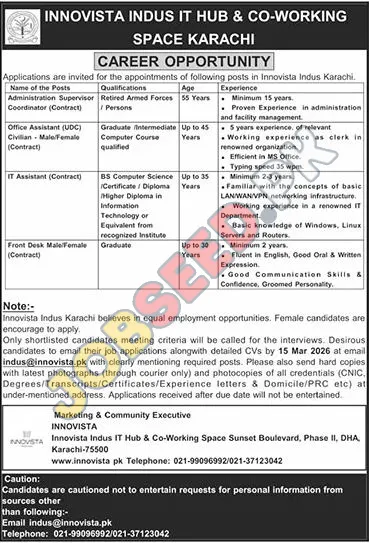 Innovista Indus IT Hub & Co-Working Space in Karachi is actively seeking skilled professionals to join their dynamic team. This private sector organization offers exciting career prospects for individuals looking to advance in the IT and administrative fields. We are committed to equal employment opportunities, encouraging diverse talent to apply for these rewarding positions. Explore these latest job openings for professional growth and development within a modern co-working environment.
