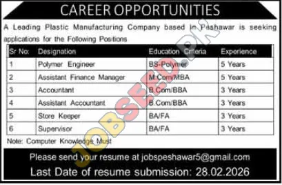 The private sector plastic manufacturing company in Peshawar is recruiting for multiple positions, including Polymer Engineer, Assistant Finance Manager, Accountant, Assistant Accountant, Store Keeper, and Supervisor. Candidates should possess relevant qualifications and experience. Excellent career advancement opportunities are offered by a leading employer.