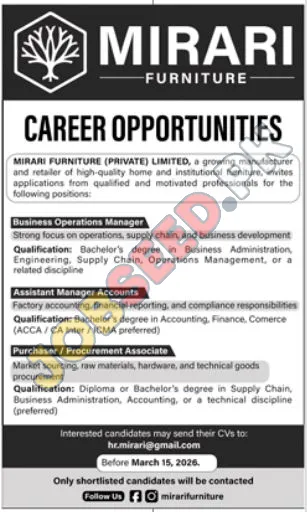 Mirari Furniture (Private) Limited, a leading private sector furniture manufacturer and retailer, is expanding its team and seeking skilled professionals. We're hiring for various positions, including Business Operations Managers, Assistant Manager Accounts, and Purchaser/Procurement Associates. These roles offer exciting opportunities for career growth within a dynamic company. Apply today and become part of our growing success!