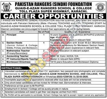 The Pakistan Rangers (Sindh) Foundation is announcing exciting career prospects for dedicated professionals at the Quaid-e-Azam Rangers School & College, located on Toll Plaza Super Highway, Karachi. This esteemed institution is seeking qualified individuals to fill both teaching and non-teaching roles. If you are passionate about education and eager to contribute to a reputable organization, these government job openings present a significant opportunity for professional growth and development.