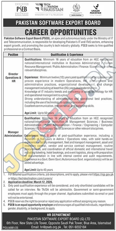 The Pakistan Software Export Board (PSEB), a prominent autonomous body operating under the Ministry of Information Technology & Telecommunication, is actively seeking talented individuals to join its team. PSEB plays a pivotal role in fostering Pakistan's IT and ITES sectors, driving export growth, and enhancing the country's global tech industry standing. These contract-based positions offer a unique chance to contribute to significant national development initiatives.