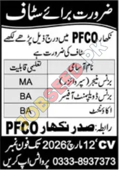 PFCO announces urgent vacancies for skilled professionals. This government sector organization is seeking individuals with qualifications ranging from Bachelor's to Master's degrees for roles including Business Manager (Supervisor), Business Development Officer, and Accountant. Additionally, top companies hiring are available for qualified candidates. Ideal candidates will possess strong academic credentials and a commitment to excellence. Discover your next career move with PFCO.