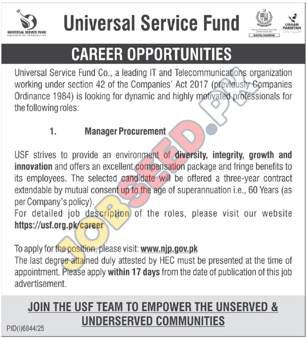 Universal Service Fund (USF), a leading organization in the IT and Telecommunications sector, is currently seeking a highly motivated Project Manager. This is an excellent opportunity to join a private sector company dedicated to empowering underserved communities. The role offers a competitive salary and benefits, including a three-year contract extendable by mutual consent. USF is committed to diversity, integrity, growth, and innovation, ensuring a rewarding career path for its employees. This is a chance to advance your career in a dynamic and forward-thinking organization. Don't miss this opportunity to contribute to a meaningful mission and be a part of the latest job openings in Pakistan.