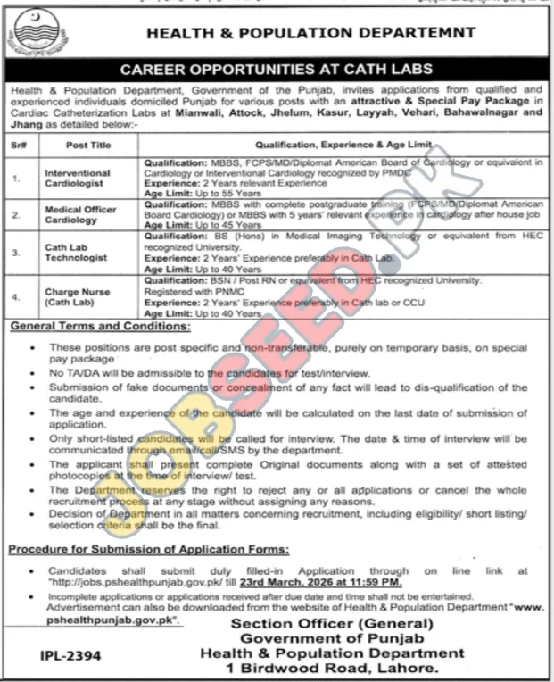 - Advertisement Download: The full advertisement can also be downloaded from the official website of the Health & Population Department: www.pshealthpunjab.gov.pk