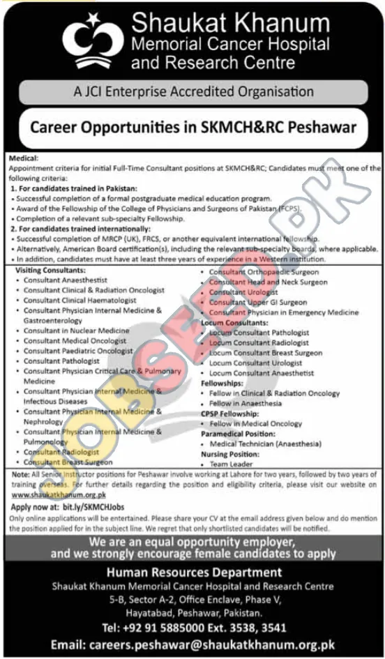 - Equal Opportunity Employer: Shaukat Khanum Memorial Cancer Hospital and Research Centre is an equal opportunity employer and encourages applications from all qualified individuals, including female candidates.