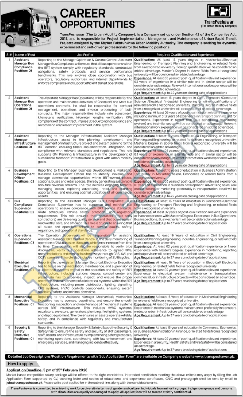TransPeshawar, a government-backed urban mobility initiative, is announcing career opportunities for skilled individuals. This organization focuses on enhancing public transportation through innovative project implementation, management, and maintenance. They are looking for candidates to fill various roles, including Assistant Manager Bus Compliance, Assistant Manager Operations, Assistant Manager Infrastructure, Business Development Officer, Bus Compliance Supervisor, Operations Supervisor, Electrical Executive, Mechanical Executive, and Security & Safety Executive. These positions offer a chance to engage in critical aspects of urban transit development and management within the public sector. Explore these private sector careers with competitive benefits.