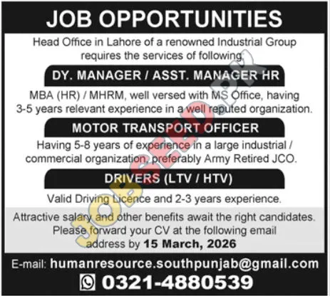 A prominent industrial group with its head office situated in Lahore is actively seeking skilled professionals to join their team. This private sector organization offers exciting career prospects for individuals looking to advance in their fields. We are particularly interested in candidates for the Dy. Successful candidates will benefit from these career opportunities. Manager / Asst. This position represents excellent Manager vacancies Lahore in the region. Manager HR role, requiring an MBA (HR) or MHRM with 3-5 years of experience and MS Office proficiency. Additionally, opportunities exist for a Motor Transport Officer with 5-8 years of experience in a large industrial or commercial setting, preferably Army Retired JCOs. Successful candidates will benefit from these latest recruitment. We are also hiring Drivers (LTV/HTV) who possess a valid driving license and 2-3 years of experience. Attractive remuneration and benefits are provided to deserving candidates. Explore these job openings and take a step towards professional growth.