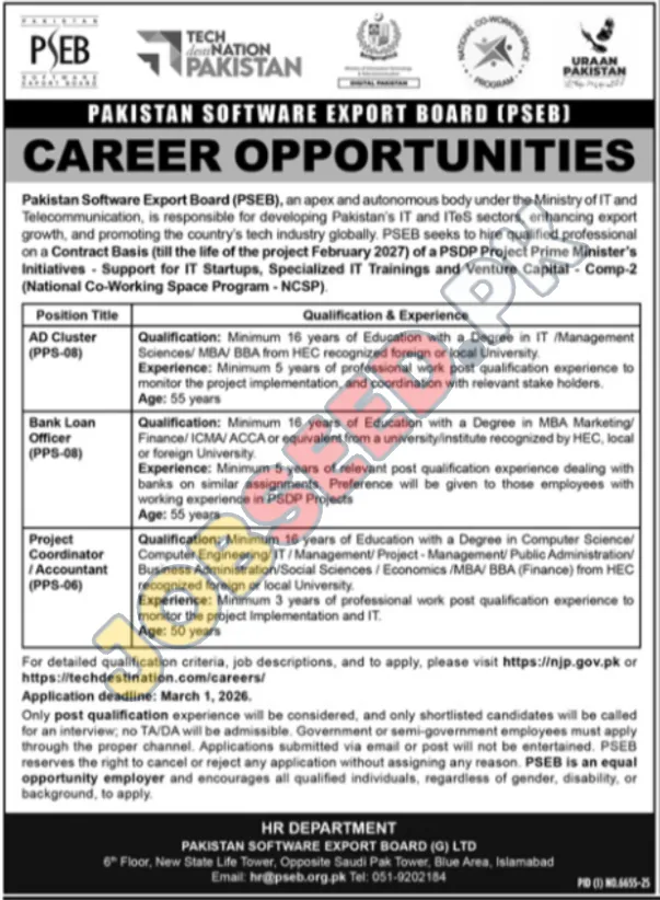 Explore government sector career advancements with the Pakistan Software Export Board (PSEB), an autonomous body driving IT and ITES sector growth. This position represents excellent private sector careers in the region. We are hiring for contract positions within the PSDP Project Prime Minister's Initiatives, focusing on IT startups, specialized IT trainings, and venture capital. Ideal candidates will find opportunities in AD Cluster, Bank Loan Officer, and Project Coordinator/Accountant roles. These positions require a minimum of 16 years of education and significant professional experience, offering a pathway to enhance your career in a leading public sector organization. Discover your next professional milestone in Pakistan's burgeoning tech landscape.