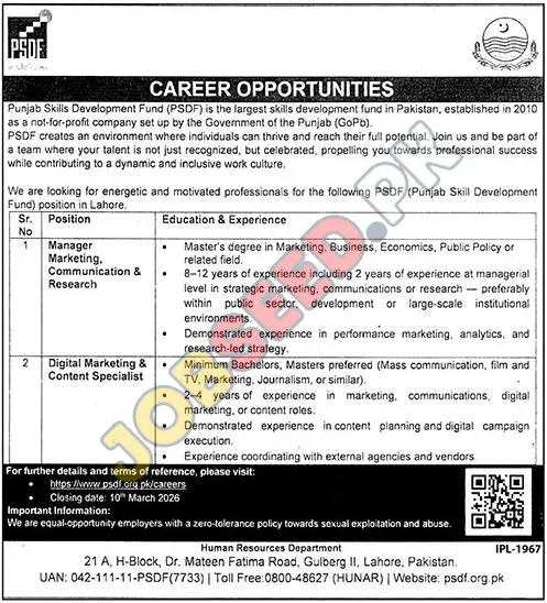 Career Opportunities: Marketing & Digital Content Specialist Roles at PSDF Lahore