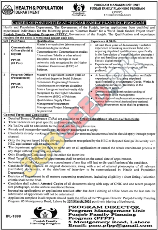 - Applications should reach the office of the "Program Director, Punjab Family Planning Program (PFPP)", 05 Montgomery Road, Lahore by 13th March, 2026, positively (during office hours).