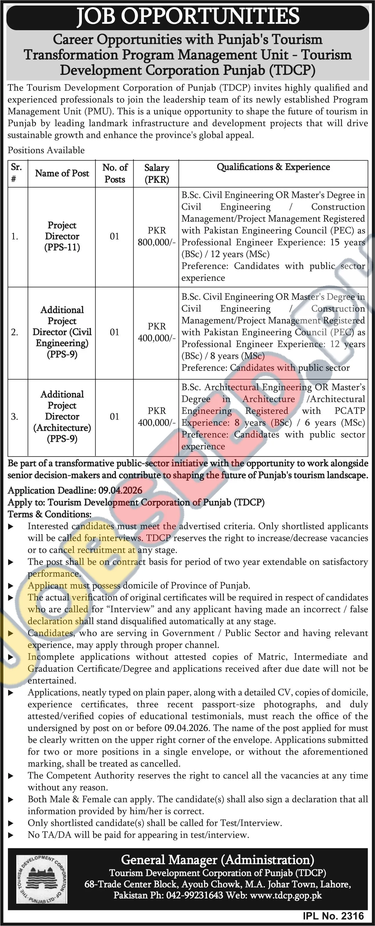 Discover government job openings in Pakistan with the Tourism Development Corporation of Punjab (TDCP). This public sector organization is hiring for Project Director and Additional Project Director roles, requiring expertise in Civil Engineering and Project Management. Explore these job vacancies 2026 with competitive benefits. Ideal candidates will have a Bachelor's or Master's degree and significant professional experience, with a preference for those with public sector experience. These contract-based positions offer a chance to contribute to transformative tourism development projects, driving economic growth and enhancing Punjab's international standing. Successful candidates will benefit from these Project Manager jobs Lahore. Explore these career opportunities for professional development and a stable government employment.