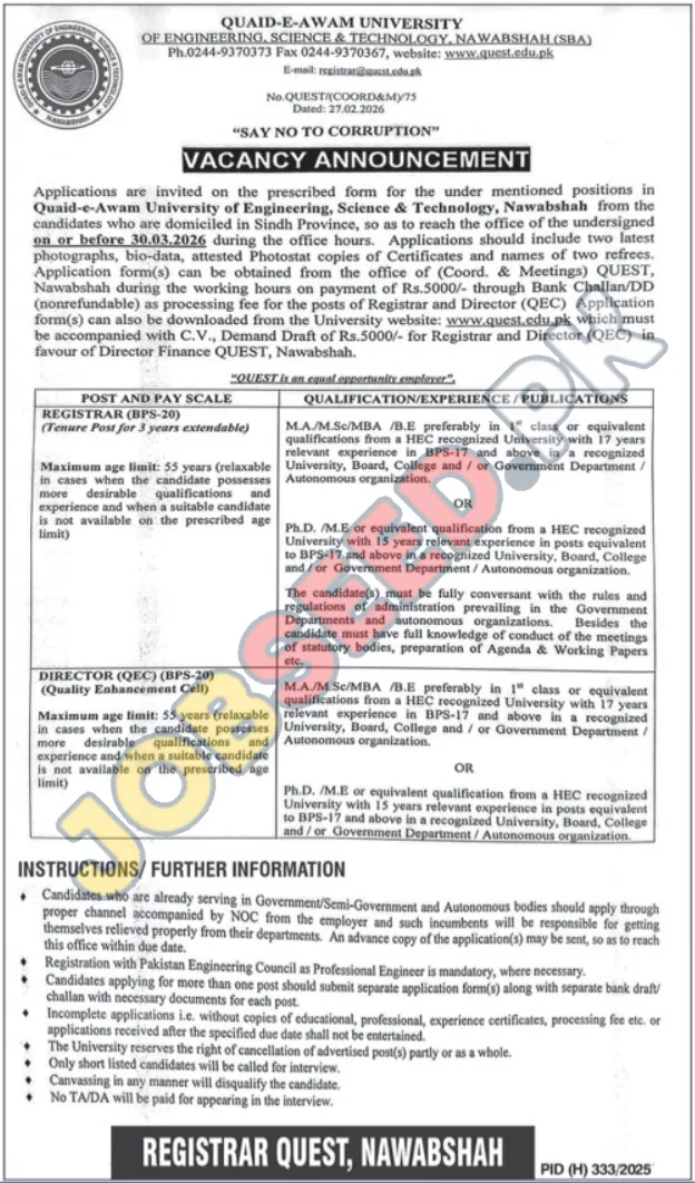 - Demand Draft: For Registrar and Director (QEC) positions, a Demand Draft of Rs.5000/- in favour of Director Finance QUEST, Nawabshah, must accompany the application.