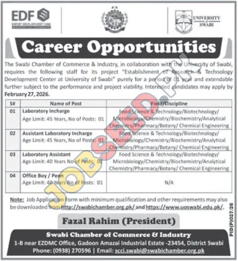 Explore exciting government sector career opportunities in Pakistan with the Swabi Chamber of Commerce & Industry, in collaboration with the University of Swabi. This project focuses on the "Establishment of Research & Technology Development Center" and seeks dedicated professionals for various roles. We are offering competitive salaries and a chance for professional growth within a government-supported initiative. If you are looking for a stable government job with excellent benefits and career development prospects, this is your chance to contribute to technological advancement. Discover the latest government vacancies and apply for a rewarding career path.