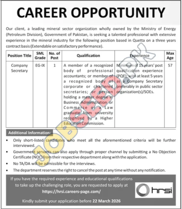The Government of Pakistan, through its Ministry of Energy (Petroleum Division), is offering a significant career opportunity for a seasoned Company Secretary. This position represents excellent Apply for Company Secretary in Quetta in the region. This role is situated within a leading mineral sector organization and is based in Quetta. The position is offered on a three-year contract basis, with the possibility of extension contingent upon satisfactory job performance. We are looking for a talented professional with substantial experience in the mineral industry to fill this vital role.