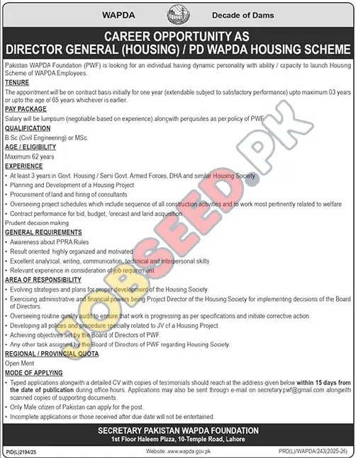 The Pakistan WAPDA Foundation (PWF) is looking for a dynamic individual to serve as Director General (Housing). This leadership role is a chance to oversee WAPDA’s housing scheme, offering a challenging yet fulfilling government sector career opportunity. The appointment is initially on a contract basis and the selected candidate will be responsible for the planning, administration, and financial oversight of the Housing Scheme ensuring excellence and progress in the housing sector. Successful candidates will benefit from these latest jobs. Candidates will be involved in long-term project planning and execution. This position provides a competitive salary and benefits, making it an attractive career prospect.