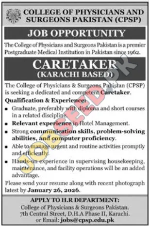 To apply for the Caretaker position: 1. **Prepare your documents**: Prepare your resume along with a recent photograph. 2. This position represents excellent College of Physicians & Surgeons Pakistan jobs in Karachi in the region. **Submit your application**: Send the required documents to the H.R Department via the email address. 3. **Application Deadline**: Ensure your application is submitted before January 26, 2026. **Contact information**: * **Email:** jobs@cpsp.edu.pk