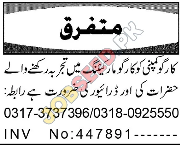 Cargo Company, Peshawar Khyber Pakhtunkhwa KPK Pakistan invites applications from eligible candidates for the post of Cargo Marketing Associate and Driver as per advertisement of 11 December, 2025, published in Aaj Newspaper. Bachelor, Literate educational qualification will be preferred.