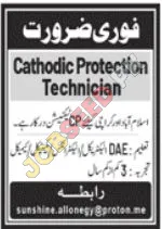 Career opportunity at Sunshine Industries located in Islamabad Islamabad Pakistan for the position of Cathodic Protection Technician. This employment notice was announced on 05 December, 2025 through Jang Newspaper. Candidates possessing a DAE degree are encouraged to submit their application.