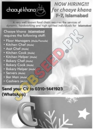 Chaaye Khana Restaurant, Islamabad Islamabad Pakistan invites applications from eligible candidates for the post of Floor Manager, Kitchen Chef, Assistant Chef, Kitchen Cook, Kitchen Helper, Bakery Chef, Bakery Cook, Bakery Helper, Server, Bar Man and Cashier as per advertisement of 07 December, 2025, published in Jang Newspaper. Bachelor, Diploma, Matric, Literate, Intermediate educational qualification will be preferred.