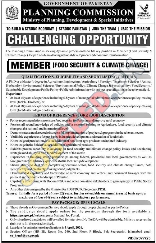 The Planning Commission, under the Ministry of Planning, Development & Special Initiatives, is offering a significant career opportunity for a Member (Food Security & Climate Change). This role is crucial for driving national development and economic transformation within Pakistan. The position requires a high level of expertise and dedication to public service.