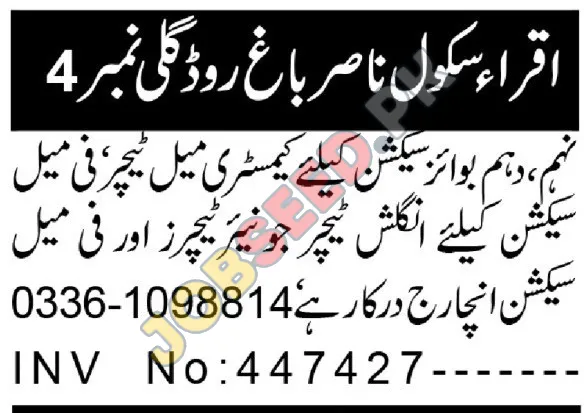 Iqra School Nasir Bagh Road is seeking enthusiastic and qualified individuals to join their team. We have multiple teaching positions available, offering an excellent opportunity to contribute to the academic growth of our students. We are currently looking for experienced educators and dedicated staff to enhance our teaching programs and overall school management.