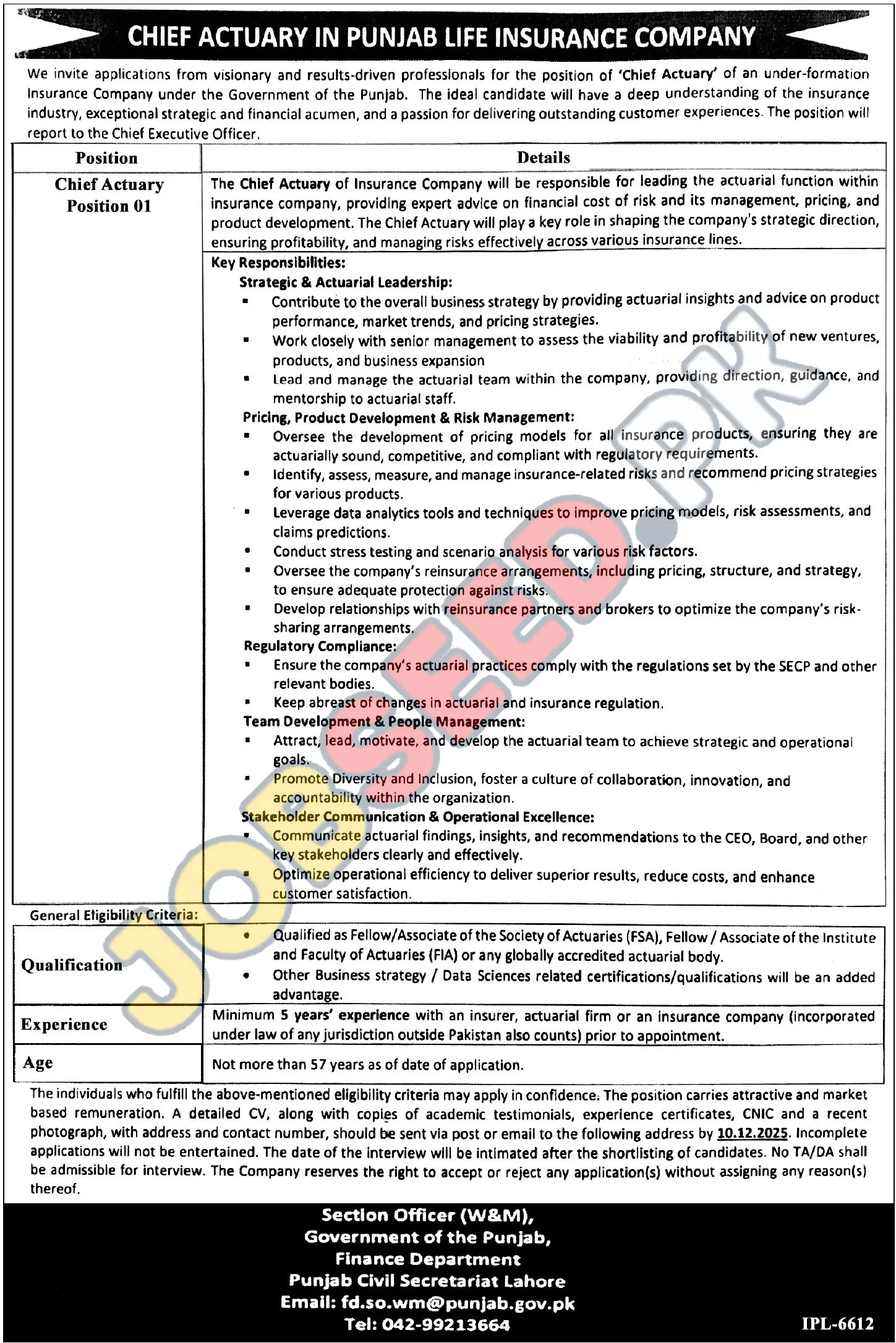 Finance Department is now recruiting in Lahore. Apply for the position of Chief Actuary. The required qualification is Master. This role is within the Management industry. The application process commenced on 22 November, 2025 via Tribune Newspaper. Interested and eligible candidates must submit their applications before the deadline on 10 December, 2025. This is a prime opportunity to join a renowned organization. For a step-by-step application guide and full eligibility criteria, please see the official advertisement on https://www.jobseed.pk.