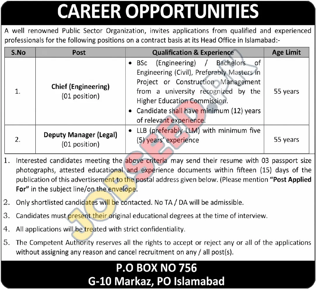 A well-reputed Public Sector Organization is seeking experienced and qualified professionals to join their team at the Head Office in Islamabad. They are offering contract-based positions for individuals looking to advance their careers and contribute to the public sector. This is a chance to be part of a dynamic organization committed to excellence.