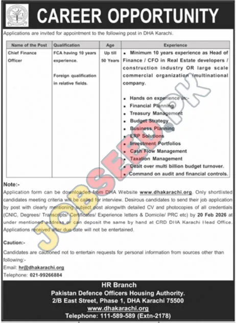 Pakistan Defence Officers Housing Authority (DHA) Karachi invites applications for the position of Chief Finance Officer. The role requires a minimum of 10 years of experience as a Head of Finance or CFO, preferably within the real estate or construction industry. Candidates must hold an FCA qualification and demonstrate expertise in financial controls, investment portfolios, and taxation management. Successful candidates will benefit from these high salary jobs. The application deadline for this senior management position in Karachi is February 20, 2026.