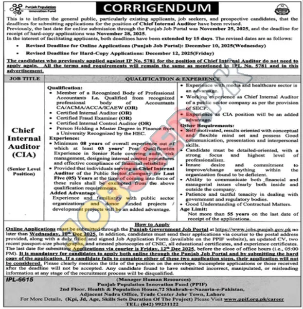 Punjab Population Innovation Fund PPIF is now recruiting in Lahore. Apply for the position of Chief Internal Auditor (CIA). The required qualification is Master. This role is within the Management industry. The application process commenced on 23 November, 2025 via Jang Newspaper. Interested and eligible candidates must submit their applications before the deadline on 10 December, 2025. This is a prime opportunity to join a renowned organization. For a step-by-step application guide and full eligibility criteria, please see the official advertisement on https://www.jobseed.pk.
