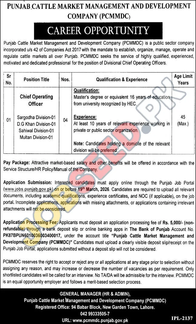 The Punjab Cattle Market Management and Development Company (PCMMC), a prominent public sector organization, is actively seeking a highly motivated and accomplished professional to fill the critical role of Chief Operating Officer. This position represents excellent job vacancies 2026 in the region. This position is integral to the company's mission of establishing, organizing, managing, and operating cattle markets throughout Punjab. PCMMC is committed to excellence and is looking for individuals who can drive operational efficiency and strategic growth.