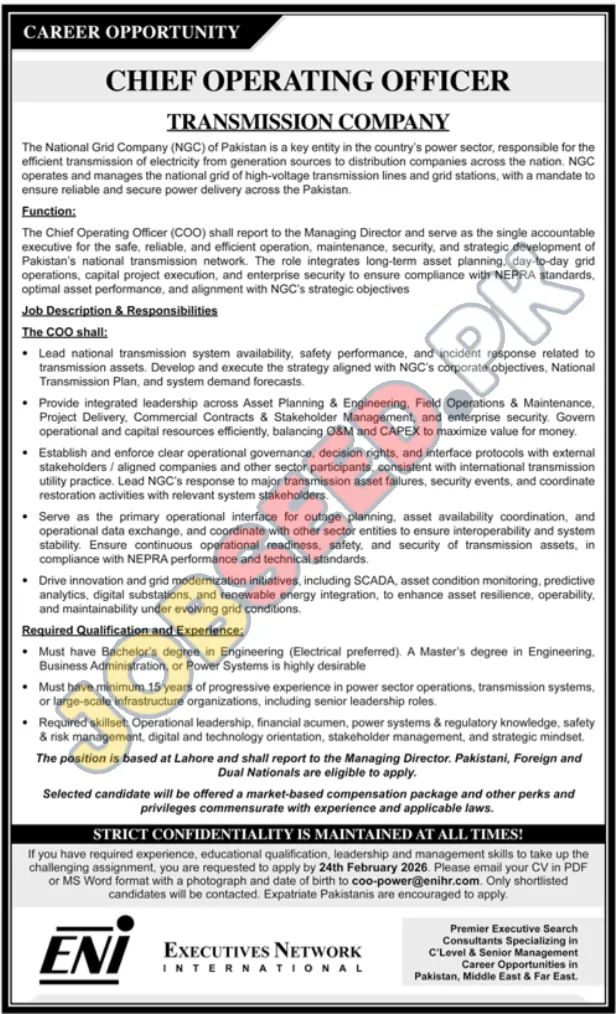 Explore senior executive career opportunities in Pakistan's power sector. The National Grid Company (NGC) is hiring a Chief Operating Officer (COO) in Lahore. This high-impact role requires a minimum of 15 years of experience in power transmission operations and a strong background in engineering or business administration. Apply before the deadline on February 24, 2026, to join a leading public sector organization.