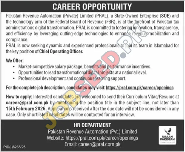 Explore a significant career opportunity as a Chief Operating Officer within Pakistan Revenue Automation (PRAL), a State-Owned Enterprise driving the digital transformation of Pakistan's tax administration. This role is ideal for experienced professionals seeking to leverage their expertise in a government sector environment focused on innovation and efficiency. The position offers substantial professional growth, competitive remuneration, and the chance to influence national digital projects. PRAL, as the technology arm of the Federal Board of Revenue (FBR), is committed to enhancing revenue mobilization and compliance through advanced technological solutions.