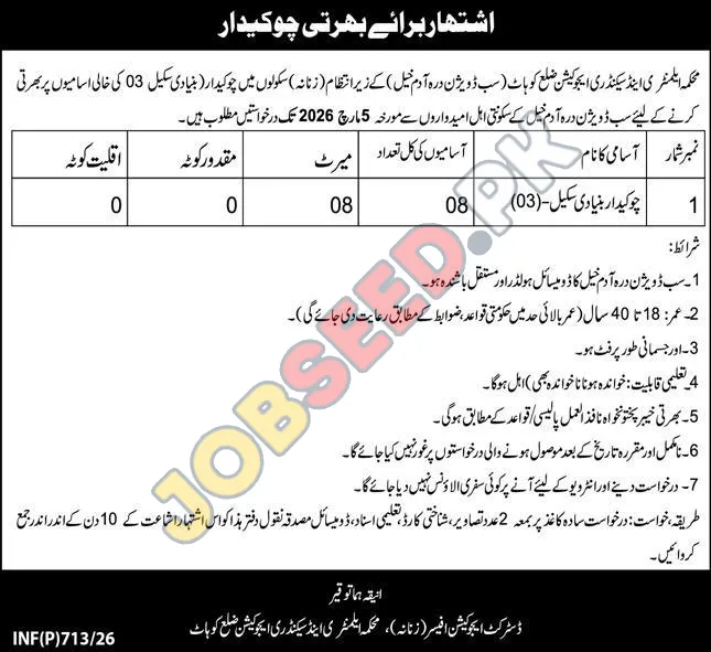 The Elementary & Secondary Education Department, Kohat is seeking skilled individuals to fill Chowkidar positions in schools within the Darra Adam Khel subdivision. This private sector opportunity offers a chance to contribute to the education sector with a competitive salary. This is a great opportunity to start or advance your career in the government sector!