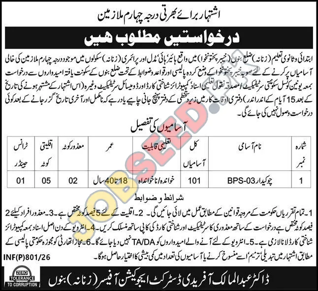 The District Education Officer (Female), Benu, has announced openings for Chowkidar positions. This is a chance to join the education sector within the government. These vacancies are for schools in Benu District, Khyber Pakhtunkhwa. Ensure that you meet the required criteria and submit within the stipulated time. Explore the chance for professional growth and contribute to community development. Don't delayβapply today!.- Government jobs