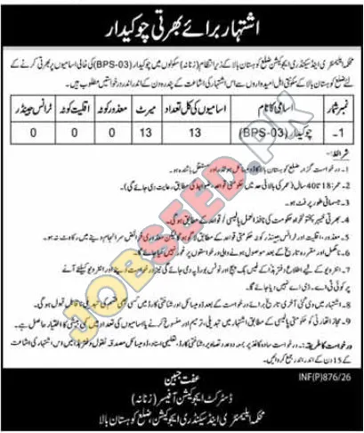 The District Education Officer (Female), Elementary & Secondary Education Department, Kohistan Bala, announces Chowkidar vacancies (BPS-03) in schools under its administration. Applications are invited from eligible residents of Kohistan Bala. This announcement presents excellent career opportunities in the public sector. The advertisement offers a competitive selection process. The closing date for application submission is within 15 days of the advertisement's publication. Ensure your application includes all necessary documents and meets the eligibility criteria for consideration in these sought-after roles.