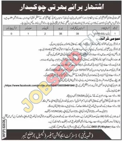 The Education Department Khyber District is seeking qualified candidates for Chowkidar positions in its schools. This government sector role offers stability and is open to residents of Khyber District. Apply within 15 days of the advertisement's publication.