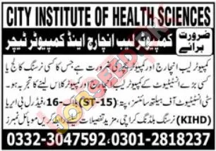 City Institute of Health Sciences, Karachi Sindh Pakistan invites applications from eligible candidates for the post of Computer Teacher and Lab Incharge as per advertisement of 30 November, 2025, published in Jang Newspaper. Master, Bachelor educational qualification will be preferred.