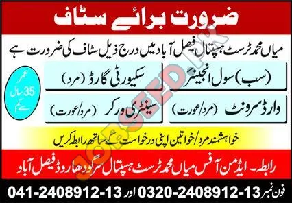 Mian Muhammad Trust Hospital, a prominent healthcare facility in Faisalabad, Pakistan, is announcing multiple job openings for qualified candidates. This government sector organization is dedicated to serving the community and is looking for individuals to fill essential roles. The advertisement highlights opportunities for skilled professionals and support staff, emphasizing the hospital's commitment to excellence in healthcare delivery. Explore these government jobs in Pakistan and consider a rewarding career path. These vacancies represent a chance to join a respected public sector entity and contribute to the well-being of the region. The hospital is keen on attracting candidates who are eager to grow professionally and are passionate about making a difference. This is an excellent opportunity for those seeking stable employment and career development within the healthcare industry.