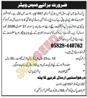 Pakistan Army, Shimla Azad Kashmir invites applications from eligible candidates for the post of Civil Mess Waiter as per advertisement of 15 January, 2026. Master educational qualification will be preferred.
