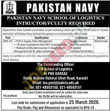 Pakistan Navy School of Logistics Announces Civilian Instructor Vacancies